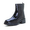 Botín mujer fabricado en piel con acabado charol coco alta selección color negro. Cierre con cremallera interior, tirador trasero y puntera redonda. Costuras vistas, detalle de marca en lateral y suela en EVA ultraligera con 5,5 cm de altura. Un diseño sofisticado, cómodo y hecho para looks tanto de día como de noche.