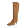 Bota de Isteria con tacón estilo chupete. Fabricada en tejido tipo antelina color camel.