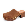 En cuanto a materiales, este modelo presenta un acabado en serraje en color cuero, muy apropiado para reforzar su aire cálido y de temporada. La suela incorpora tacón ancho y plataforma con detalles metálicos laterales que aportan un toque decorativo y un aire más marcado al diseño. Un zueco muy combinable para quienes buscan altura, comodidad visual y un estilo con más personalidad.