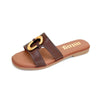Este modelo presenta una pala ancha que sujeta bien el empeine y un adorno metálico central en acabado dorado que aporta un detalle decorativo visible sin recargar el conjunto. La combinación entre el color moka y ese herraje le da un aire elegante, pero manteniendo una línea cómoda y práctica para el día a día del verano.